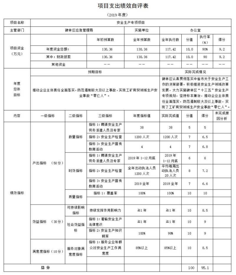 根据预算绩效管理要求,本部门组织对 2019年一般公共预算项目支出全面开展绩效自评。其中,此次开展的自评项目为“安全生产专项”,共涉及资金130.36万元,占一般公共预算项目支出总额的25.41%。2019年,我部门无政府性基金预算项目支出。