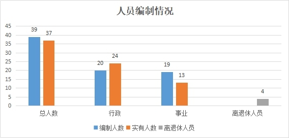 截止2019年底,本部门人员编制39人,其中行政编制20人、事业编制19人;实有人员37人,其中行政24人、事业13人。单位管理的离退休人员4人。