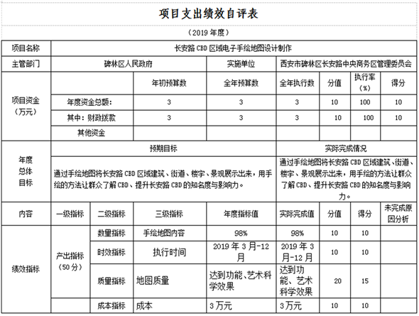 手绘电子地图设计项目绩效自评综述:根据年初设定的绩效目标,项目自评得分89分。项目全年预算数3万元,执行数 3万元,完成预算的100%。主要产出和效果:通过项目实施CBD区域电子手绘地图以更好的方便服务群众。发现的问题及原因:地图上刊载信息具有时效性,易发生变化,不便于长久使用。下一步改进措施:需要进一步细化明晰CBD区域电子手绘地图,加大文化、政策宣传力度,以更好的方便服务群众,提升和优化全区营商环境。