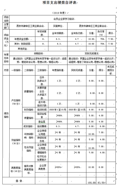 会员企业学习培训项目绩效自评综述:根据年初设定的绩效目标,项目自评得分83.5分。项目全年预算数6.3万元,执行数4.7万元,完成预算的75%。主要产出和效果:通过项目实施,让民营企业家和专家学者一起谈认识、话感受,增进政治认同、思想认同、情感认同。更好地加强和改进非公有制经济人士思想政治工作,进一步做好政府和企业的沟通桥梁。发现的主要问题:培训形式无创新性,需要改进和提高。下一步改进措施:开展培训工作时,可更多的具有创新性,进一步提升企业家的满意率,增强培训效果,提升企业家的持续认同感。
