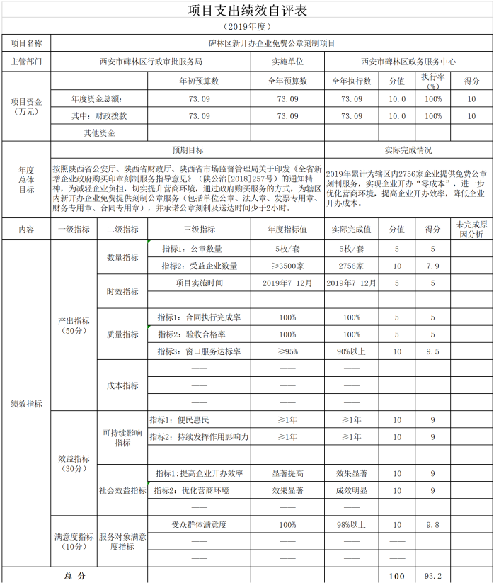 辖区内新开办企业免费公章刻制项目绩效自评综述:根据年初设定的绩效目标,项目自评得分93.2分。项目全年预算数73.09万元,执行数 73.09万元,完成预算的100%。主要产出和效果:通过项目实施2019年累计为辖区内2756家企业提供免费公章刻制服务,实现企业开办“零成本”,进一步优化营商环境,提高企业开办效率,降低企业开办成本。发现的主要问题:效益指标得分略低,需要改进和提高。下一步改进措施:要进一步落实陕西省公安厅、陕西省财政厅、陕西省市场监督管理局关于印发《全省新增企业政府购买印章刻制服务指导意见》(陕公治[2018]257号)的通知精神,持续为辖区新开办企业提供免费公章刻制服务,通过压缩审批时限、优化办事流程,不断提高工作效率,打造企业开办“一条龙”服务链条。