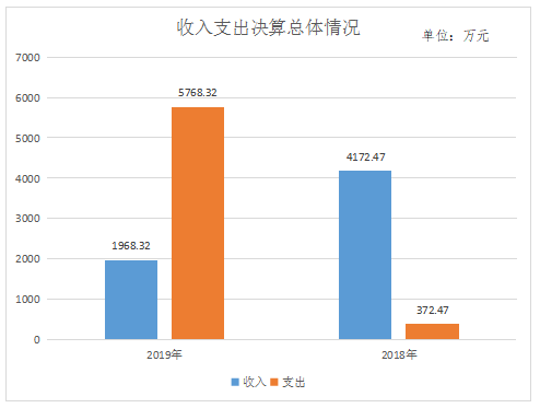 2019年财政拨款总收入为1968.32万元,较上年减少2204.15万元,下降52.83%,主要原因是2018年用于新政务服务大厅建设专项款3800万元结余结转到2019年。