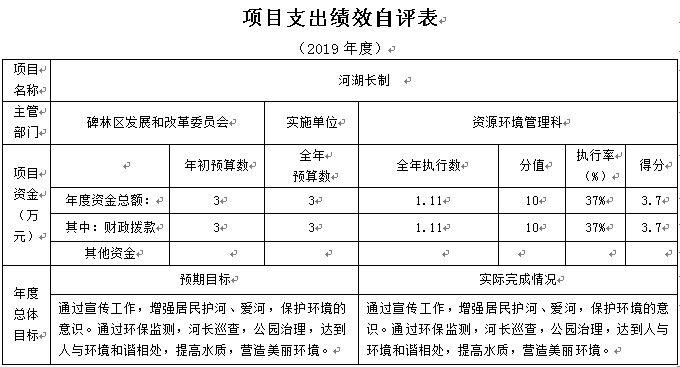 根据预算绩效管理要求,本部门组织对 2019年一般公共预算项目支出全面开展绩效自评,其中,此次开展自评项目为“河湖长制”,共涉及资金1.11万元,占一般公共预算项目支出总额的0.12%。2019年,我单位无政府性基金预算项目支出。