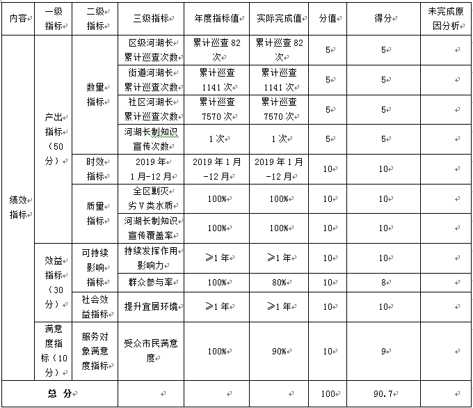 河湖长制项目绩效自评综述:根据年初设定的绩效目标,项目自评得分91.7分。项目全年预算数3万元,执行数1.11万元,完成预算的0.37%。主要产出和效果:通过项目实施增强居民护河、爱河保护环境的意识。通过环保监测,河长巡查,公园治理,达到人与环境和谐相处,提高水质,营造美丽环境。工作中发现的问题:年初项目预算测算不够精准。群众参与率及环境意识有待进一步提高。下一步改进措施:需要加大护河、爱河,保护环境宣传工作力度广度,增强居民的环境保护意识。