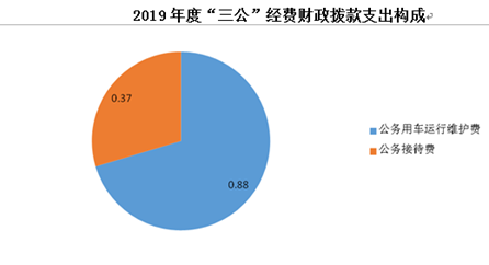 2019年“三公”经费财政拨款支出决算中,因公出国(境)费支出决算0万元,占0%;公务用车购置费支出0万元,占0%;公务用车运行维护费支出决算0.88万元,占69.84%;公务接待费支出决算0.37万元,占29.37%。具体情况如下