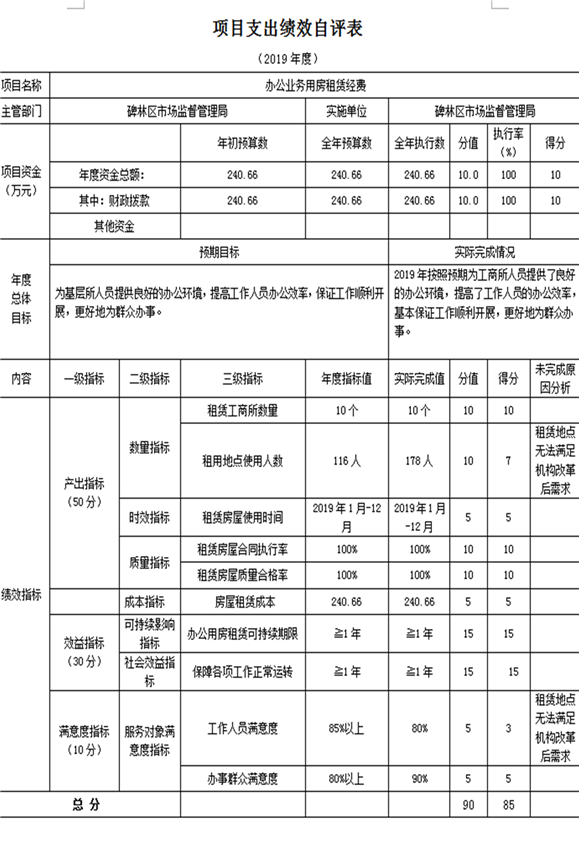 办公业务用房租赁经费项目绩效自评综述:根据年初设定的绩效目标,项目自评得分95分。项目全年预算数240.66万元,执行数 240.66万元,完成预算的100%。主要产出和效果:为市场监管所人员提供良好的办公环境,提高工作人员办公效率,保证工作顺利开展,更好地为群众办事。发现的主要问题:因我单位本年实施机构改革,现办公场所不能满足机构改革后市场监管所的办公需求,需在2020年重新对办公场址进行规划。下一步改进措施:根据属地管理原则,按照街办的行政区划,结合辖区市场监管主体的特点和市场监管所人员编制情况,对办公用房现状进行梳理,重新租赁办公场所。