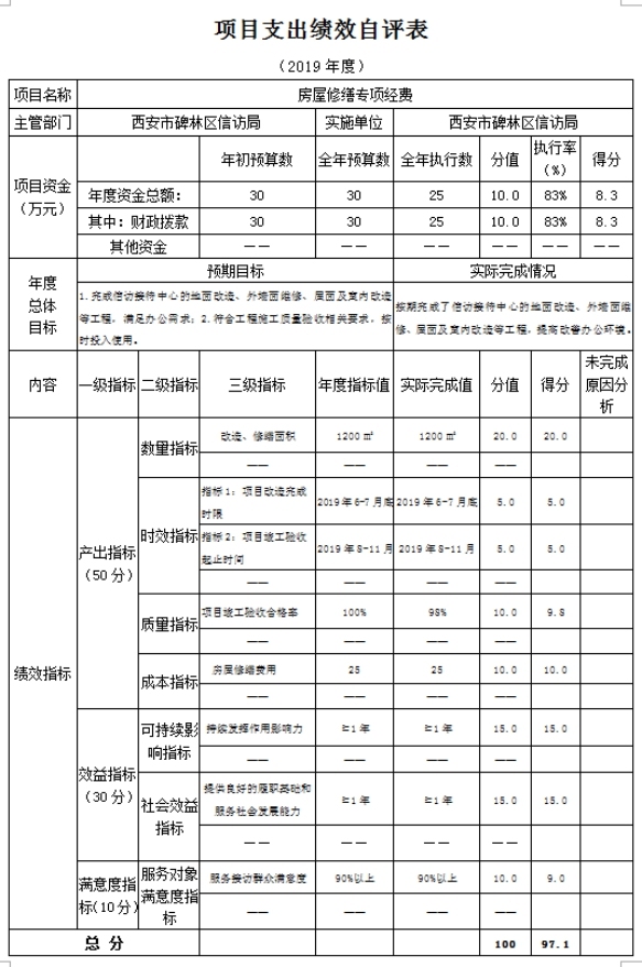 房屋修缮专项经费项目自评综述:根据年初设定的绩效目标,项目自评得分97.1分。项目全年预算数30万元,执行数25万元,完成预算的83%。主要产出和效果:通过对信访接待中心地面改造、外墙面维修、屋面及室内的修缮和装饰,进一步提高和改善了办公环境,为接访群众创造一个良好而舒心的环境。发现的主要问题:接待大厅个别死角和特别人群尤其是接待老弱病残人士的特殊环境还有待改进和提高。下一步改进措施:提高接访服务质量和服务效率,为创建人民群众满意的接待中心而努力。