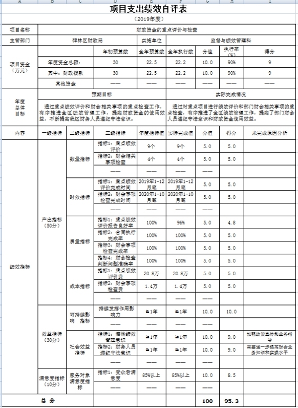 财政资金的重点评价与检查项目绩效自评综述:根据年初设定的绩效目标,项目自评得分95.3分。项目全年预算数22.5万元,执行数 22.2万元,完成预算的90%。主要产出和效果:通过对重点项目进行绩效评价和部门财会相关事项的重点检查,有序推进了全区绩效管理工作,提高了部门财会人员遵纪守法意识和财政资金使用效益。发现的主要问题:服务对象满意度指标得分略低,需要改进和提高。下一步改进措施:需要进一步加强预算绩效管理相关政策宣传和业务指导,努力提高部门财会业务知识和实操水平,不断完善全面规范透明、标准科学、约束有力的预算制度,切实提高财政资源配置效率和财政资金使用效益。
