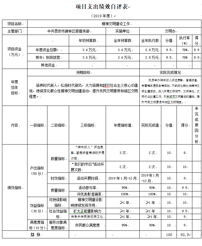 精神文明建设工作项目绩效自评综述:根据年初设定的绩效目标,项目自评得分92.9分。项目全年预算数3.6万元,执行数2.8万元,完成预算的78%。主要产出和效果:通过项目实施培养时代新人,弘扬时代新风,大力培育和践行社会主义核心价值观,持续深化群众性精神文明创建活动,提升市民文明素质和城区文明程度。发现的主要问题:服务对象满意度指标得分略低,需要改进和提高。下一步改进措施:需要进一步加强相关政策宣传和业务指导,持续深化群众性精神文明创建活动,提升市民文明素质和城区文明程度。