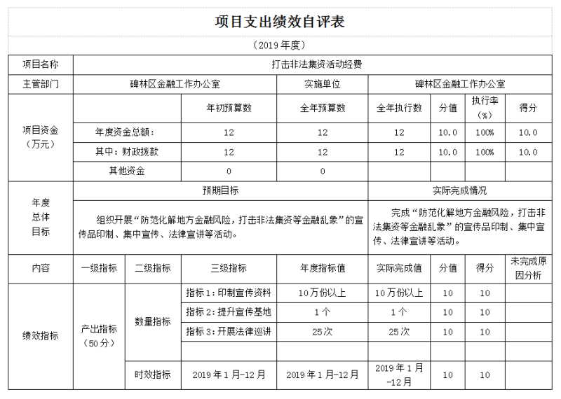 根据预算绩效管理要求,本部门组织对 2019年一般公共预算项目支出全面开展绩效自评,其中,此次开展自评项目为打击非法集资活动经费,涉及资金12万元,占一般公共预算项目支出总额的1.5%。2019年,我部门无政府性基金预算项目支出。