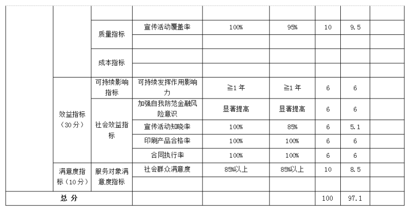 打击非法集资活动经费项目绩效自评综述:根据年初设定的绩效目标,项目自评得分97.5分。项目全年预算数12万元,执行数 12万元,完成预算的100%。主要产出和效果:通过项目实施协调有关部门做好金融突发事件应急工作和打击非法集资工作,防范、化解、处置各类金融风险。发现的问题及原因:宣传形式缺乏创新性。下一步改进措施:需要进一步加强预算绩效管理相关政策宣传和业务指导,努力提高部门财会业务知识和实操水平;组织辖区机关、金融企业开展宣传教育活动,深入社区、小区、企业发放宣传品。
