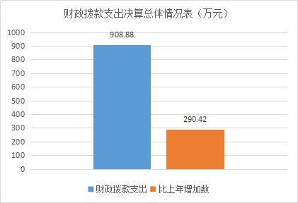 年财政拨款总支出908.88万元,较上年增加290.42万元,增长47%,主要原因新增PPP办及增加企业奖励资金。