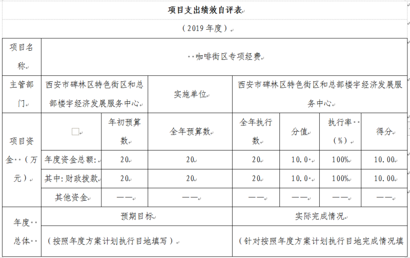 根据预算绩效管理要求,本部门组织对 2019年一般公共预算项目支出全面开展绩效自评,其中,此次开展自评项目(特色街区建设管理专项经费),涉及资金20万元,占一般公共预算项目支出总额的100%。组织对 2019年我部门无政府性基金预算项目支出。