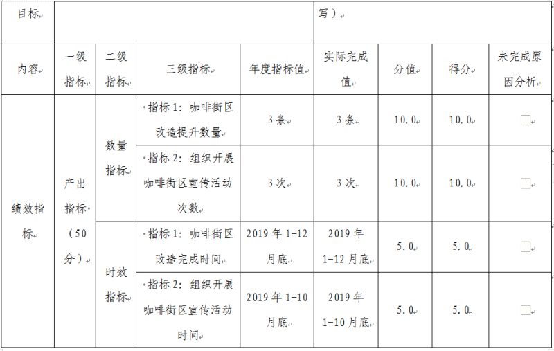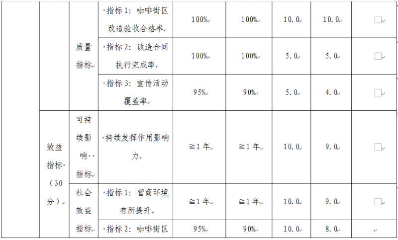 咖啡街区专项经费项目绩效自评综述:根据年初设定的绩效目标,项目自评得分85分。项目全年预算数20万元,执行数 20万元,完成预算的100%。主要产出和效果:通过项目实施举办街区宣传推介活动、街区提升改造活动、街区旅游文化艺术节活动、开展全国省市区特色街区创建活动,扩大街区影响率及知晓度,进一步提升营商环境。发现的问题及原因:宣传活动覆盖率需进一步增加。下一步改进措施:街区活动进一步运用新媒体大众传媒增加活动宣传力度,积极推进政企结合,大力发展街区文化。
