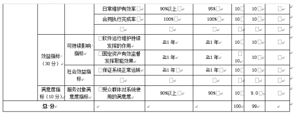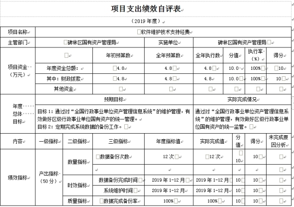 软件维护技术支持经费项目绩效自评综述:根据年初设定的绩效目标,项目自评得分99分。项目全年预算数4.8万元,执行数4.8万元,完成预算的100%。主要产出和效果:通过对“全国行政事业单位资产管理信息系统”的维护管理,有效做好区级行政事业单位国有资产的统一监管。发现的主要问题:软件维护中,需要提高维护人员的服务意识,努力提高受众群体的满意度。