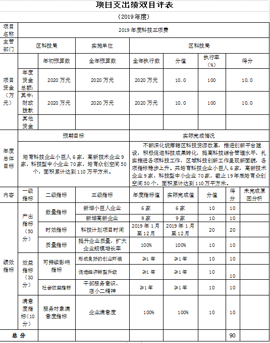 财政资金的重点评价与检查项目绩效自评综述:根据年初设定的绩效目标,项目自评得分10分。项目全年预算数2020万元,执行数2020万元,完成预算的100%。主要产出和效果:不断深化统筹辖区科技资源改革,推进创新平台建设,积极促进科技成果转化,提高科技综合管理水平,扎实推进各项科技工作,区域科技创新工作呈现新面貌,各项指标稳步上升。共培育科技企业小巨人6家,高新技术企业9家,科技型中小企业70家,截止19年底培育众创空间50个,面积累计达到110万平方米。我局重视项目预算绩效管理工作,完善经费的使用制度,合理支配财政经费,并按时按期拨付给企业和部门相关资金,无超范围不合理使用经费的情况。通过对重点项目进行绩效评价和部门财会相关事项的重点检查,有序推进了我局绩效管理工作,提高了财会人员遵纪守法意识和财政资金使用效益,并能较好的完成单位各项任务,实现年初约定的绩效目标。预算执行过程中存在因工资奖金预算不够而调整的情况,为统一调整。下一步加强预算绩效管理工作,切实提高科技资源配置效率和专项资金使用效益。