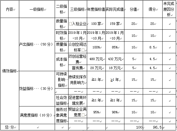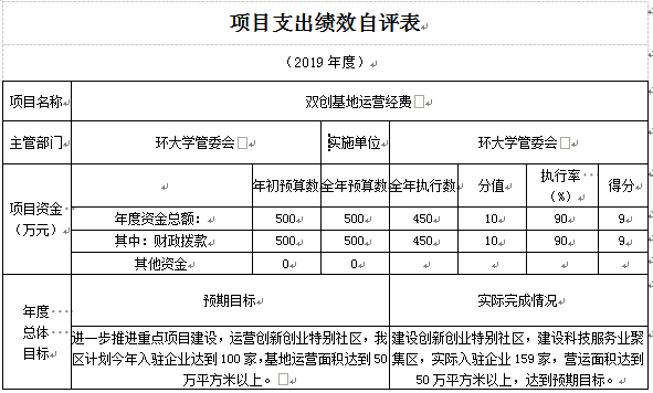 根据预算绩效管理要求,本部门组织对 2019年一般公共预算项目支出全面开展绩效自评,其中,此次开展自评项目双创示范基地建设,涉及资金450万,占一般公共预算项目支出总额的98.26%。2019年,我部门无政府性基金预算项目支出。