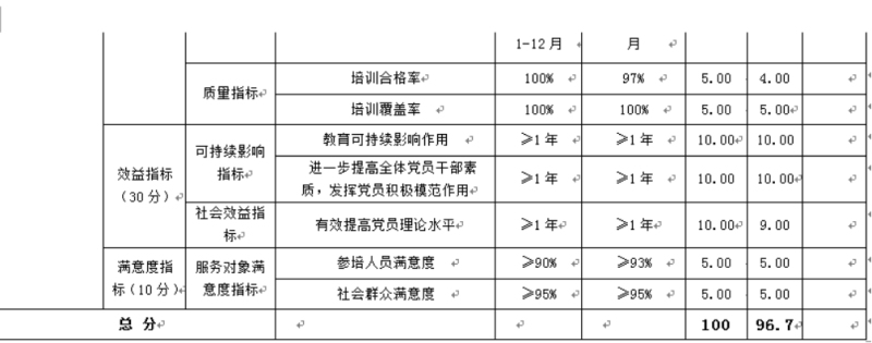 干部教育项目绩效自评综述:根据年初设定的绩效目标,项目自评得分96.7分。项目全年预算数5万元,执行数 5万元,完成预算的100%。主要产出和效果:通过项目实施组织好人员培训、加强人才队伍建设,提高官大党员干部能力素养业务水平和党性觉悟。发现的问题及原因:1、切实提高党员教育培训工作质量,努力建设政治合格、执行纪律合格、品德合格、进一步增强培训合格率,2、开展丰富多样的教学提高党员培训理论水平