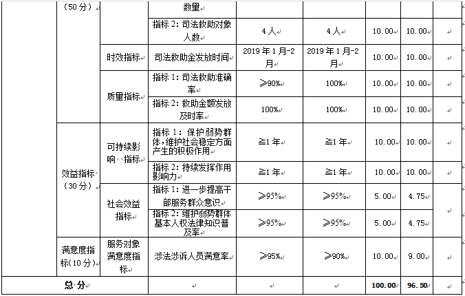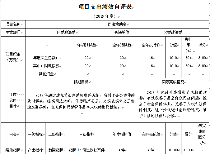 按照要求,2019年对我委司法救助资金项目进行了绩效评价。项目自评得分96.5分。项目全年预算数20万元,执行数16万元,完成预算的80%。主要产出和效果:通过开展国家司法救助活动,有效改善了基层群众民生问题,健全了社会保障体系,完善了人权司法保障制度,进一步促进社会和谐稳定,维护司法的权威和公信。发现的主要问题:全区司法救助案件数量和救助范围有待进一步扩大,涉法涉诉人员满意率还需要进一步提高。下一步改进措施:进一步完善和改进社会保障体系和司法保障制度建设,不断提高干部服务群众意识和能力。