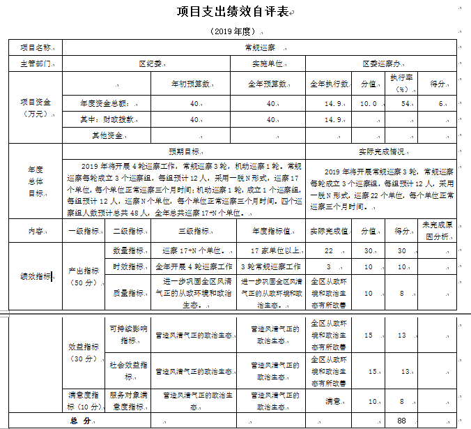 常规巡察项目绩效自评综述:根据年初设定的绩效目标,项目自评得分88分。项目全年预算数40万元,执行数14.9万元,完成预算的54%。主要产出和效果:通过项目实施轮成立3个巡察组,每组预计12人,采用一脱N形式,巡察22个单位,每个单位正常巡察三个月时间,全区从政环境和政治生态有所改善。发现的问题及原因:项目实施的时间节点把握还不够准确。下一步改进措施:提高巡察工作效率。