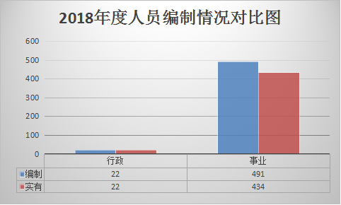 截止2018年底,本部门人员编制513人,其中行政编制22人、事业编制491人;实有人员456人,其中行政22人、事业434人。单位管理的离退休人员380人。