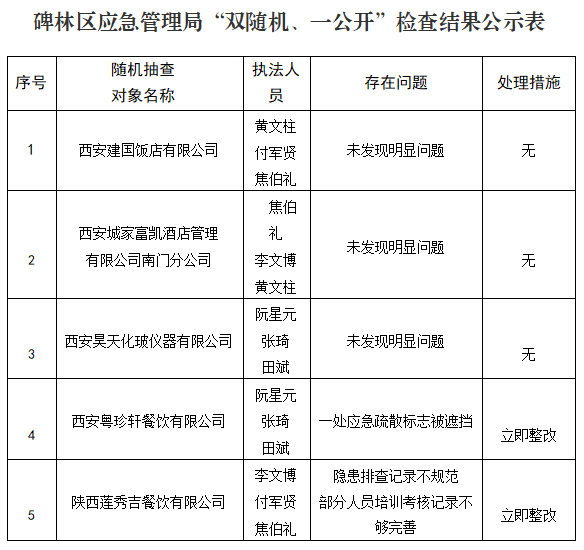 根据中、省、市“双随机、一公开”随机抽查公示及2023年度安全生产监督检查计划的要求,我局自2023年9月—10月对西安建国饭店有限公司等5家企业进行了执法检查,现将检查结果予以公示。