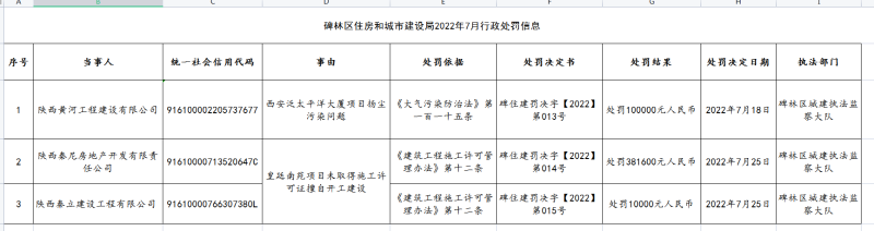 碑林区住房和城市建设局2022年7月行政处罚信息