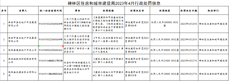 碑林区住房和城市建设局2023年4月行政处罚信息