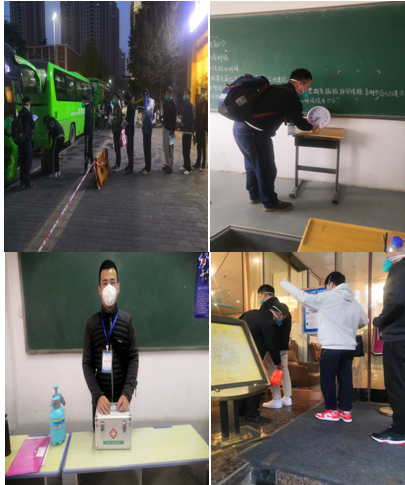 为了让每一个转运细节都没有遗漏、不出差错,专班及全体工作人员共同发力、煞费苦心。提前预约转运车队,以考场为单位分组指派带队老师负责清点人数、收发手机等,在车门旁、文具袋上均贴有不同颜色的对应序号,以便对号上车、分批分次;专班为考生发放口罩、手消等防护物品,设立考场临时医护点,确保考生健康安全;得知考场没有钟表,金盾之光培训机构给每个考场购置石英钟,此外还免费提供了此次考试的所有文具用品;饮食上酒店采用荤素搭配、餐后水果,实现营养均衡。