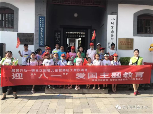 困境儿童庇护所成立后,在碑林区民政局的支持和指导下,碑林区困境儿童救助帮扶工作已陆续开展。7月31日,碑林社会组织阳光社工开展“展翼行动-碑林区困境儿童爱国主题教育”活动。