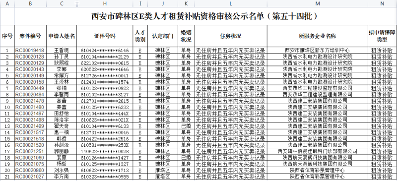 为贯彻落实《西安市深化人才发展体制机制改革,打造“一带一路”人才高地若干政策措施》精神,按照《中共西安市委组织部 西安市住房保障和房屋管理局 关于向E类人才发放租赁补贴的通知》(市房发〔2018〕65号),现将2022年E类人才租赁补贴资格审核名单予以公告。公示期限为5个工作日,请广大居民监督或投诉。如对公示人员有异议,请于2022年5月24日前向区住房保障中心反映。