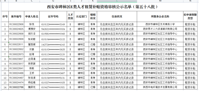 西安市碑林区E类人才租赁补贴资格审核公示名单(第五十八批)