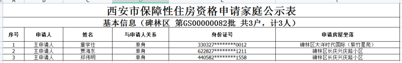 西安市保障性住房资格申请家庭公示表