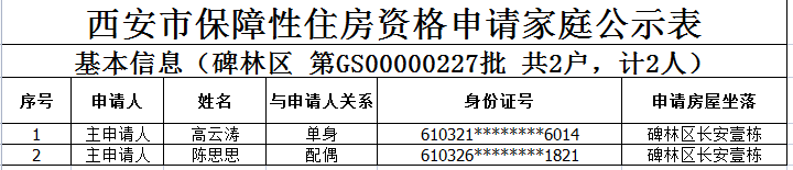 西安市保障性住房资格申请家庭公示表