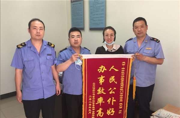 5月18日,一位消费者将一面印有“人民公仆好,办事效率高”的锦旗送到碑林区南院门市场监管所,感谢市场执法人员们为消费者办实事,解决实际问题而付出的辛苦努力。