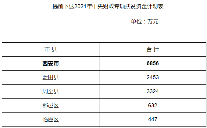按照《西安市扶贫资金项目公告公示实施细则》(市脱贫办发〔2018〕60号)要求,为了充分体现公开、公平、公正,进一步加强和规范财政专项扶贫资金使用与管理,提高资金使用精准度和效益,现将提前下达2021年中央财政专项扶贫资金安排情况予以公告。