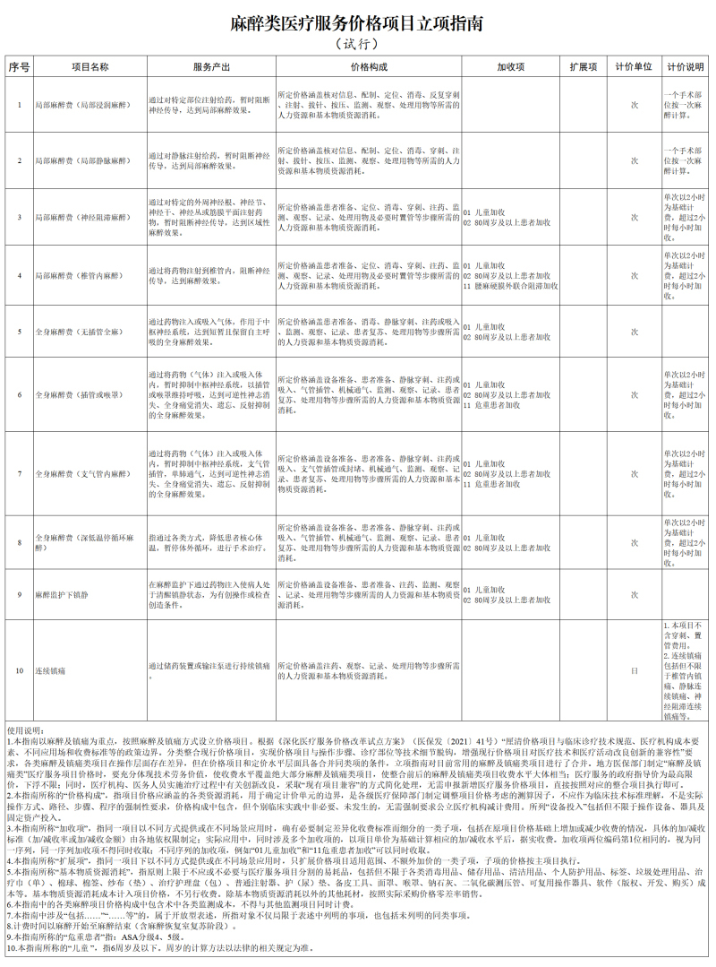编制说明:为贯彻落实《深化医疗服务价格改革试点方案》,推进全国医疗服务价格项目规范编制工作,按照“成熟一批、发布一批”的工作思路,近日国家医保局编制印发《麻醉类医疗服务价格项目立项指南(试行)》,参考2023年版医疗服务项目技术规范,将现行麻醉类价格项目映射整合为10项,下一步将指导各省医保局参考,结合实际做好对接落实,制定全省统一的价格基准,由具有价格管理权限的统筹地区对照全省价格基准,上下浮动确定实际执行的价格水平。