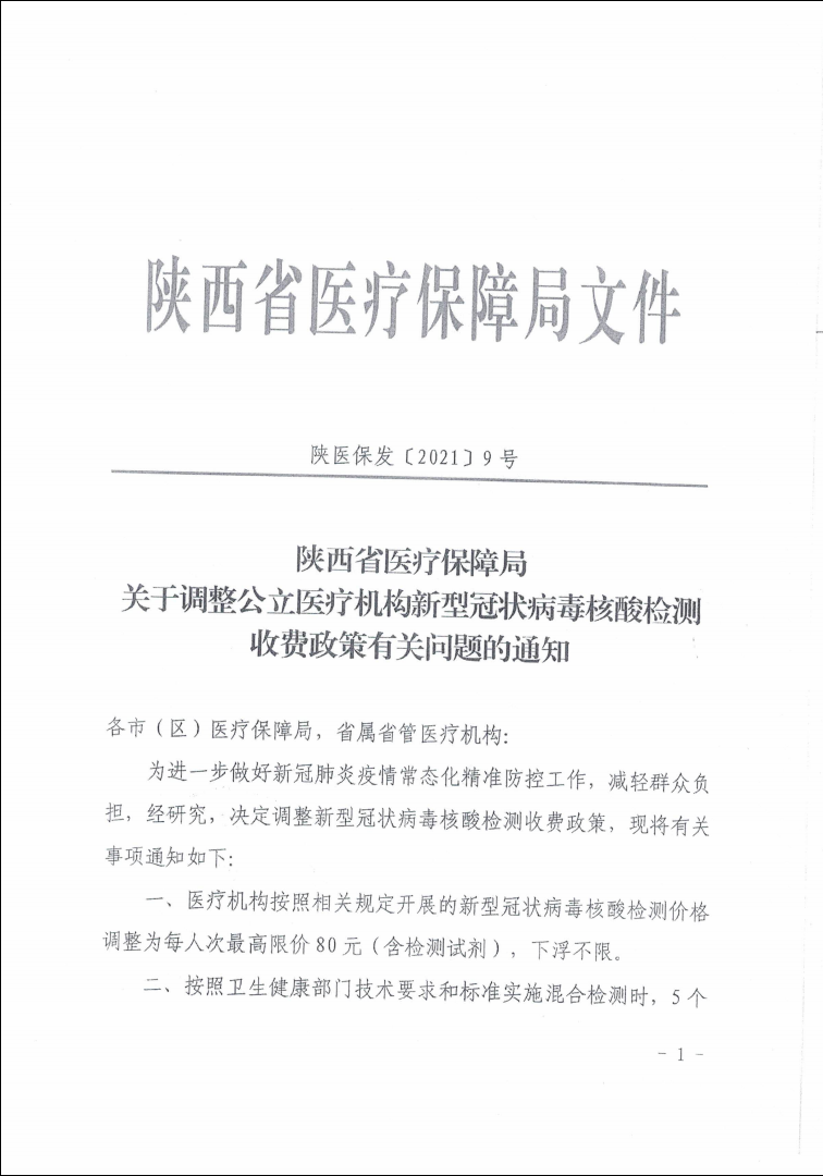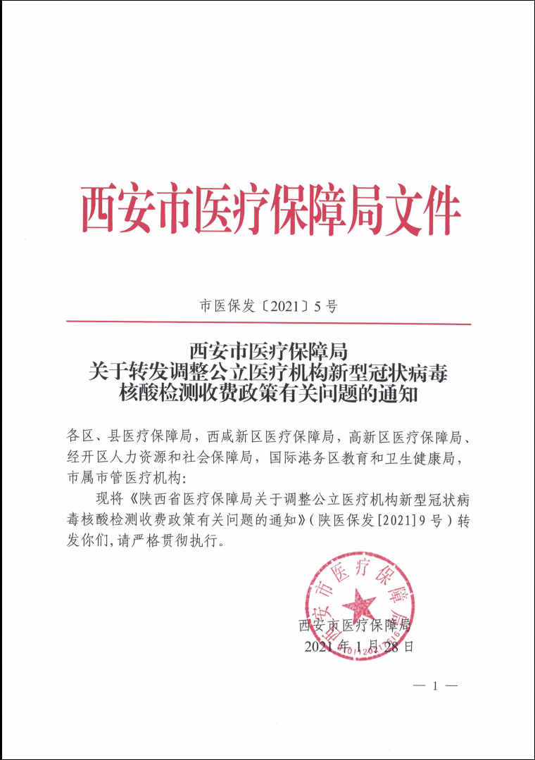 西安市医疗保障局关于转发调整公立医疗机构新型冠状病毒核酸检测收费政策有关问题的通知