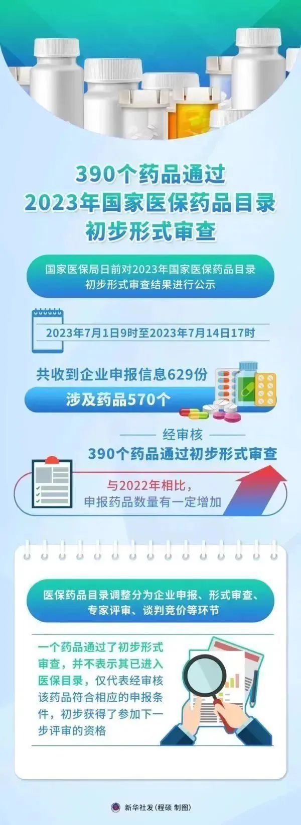 根据2023年国家基本医疗保险、工伤保险和生育保险药品目录(以下简称国家医保药品目录)调整工作安排,在相关部门的支持下,国家医保局近期对申报药品进行了初步形式审查,根据公布的信息,2023年7月1日9时至2023年7月14日17时,共收到企业申报信息629份,涉及药品(通用名,下同)570个。经审核,390个药品通过初步形式审查。与2022年相比,申报药品数量有一定增加。