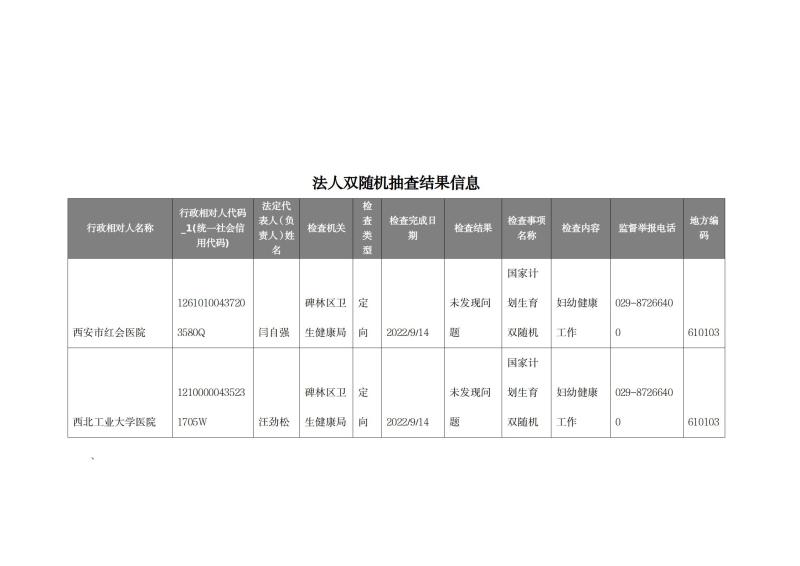 西安市碑林区2022年国家双随机监督抽检结果公示(妇幼健康)