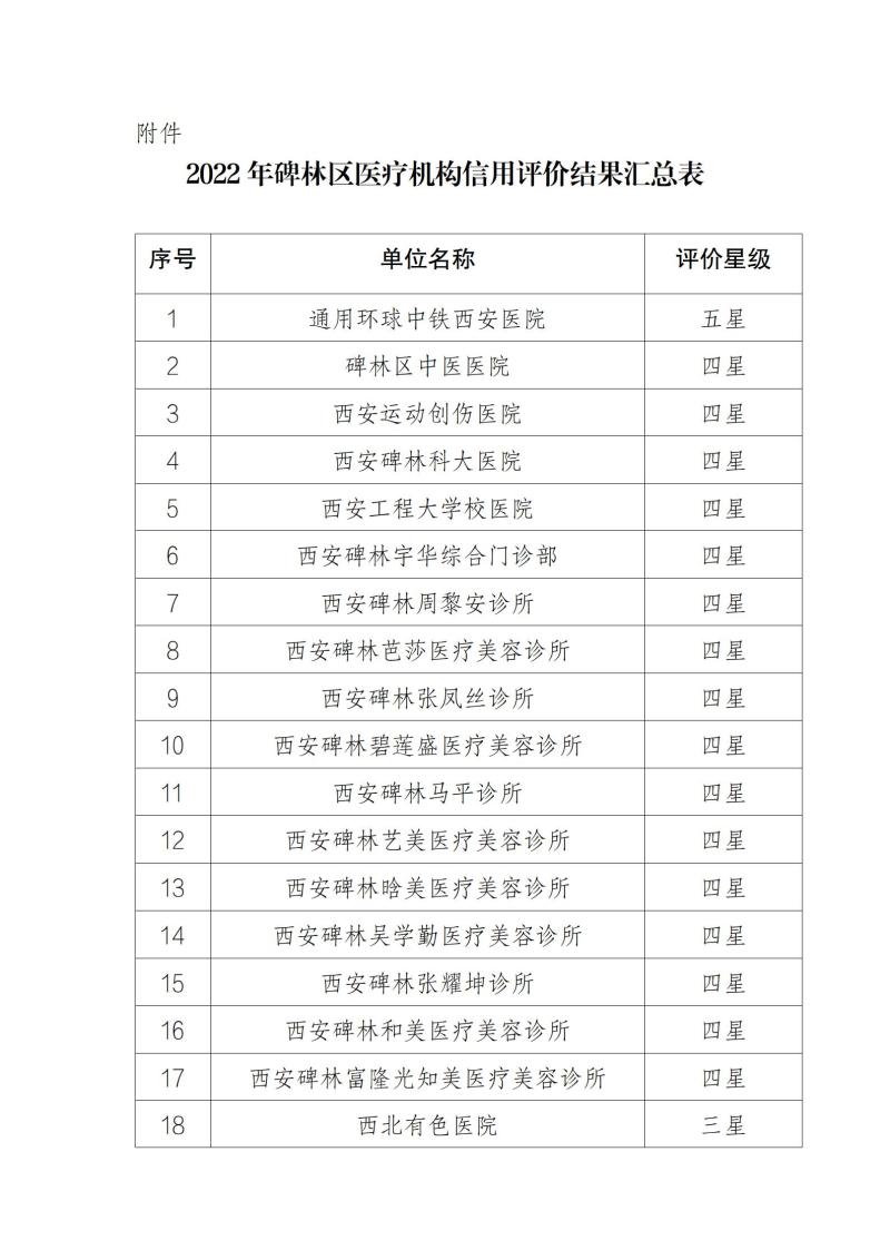 根据《西安市卫生健康委员会关于开展医疗机构信用评价工作的通知》(市卫函〔2022〕97号),在医疗机构申报的基础上,由碑林区卫生健康局初审,市卫生健康委复核,现将碑林区2022年度医疗机构信用评价结果予以通告。