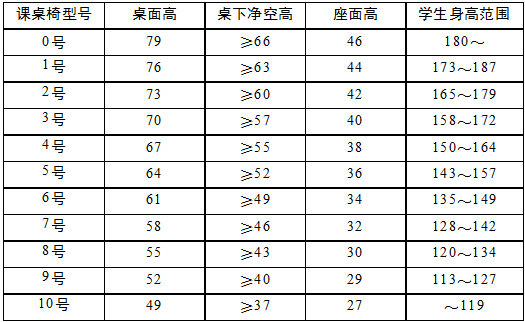 ③ 课桌椅分配原则:应符合国家标准GB/T3976-2014《学校课桌椅功能尺寸及技术要求》的规定,详见下表。