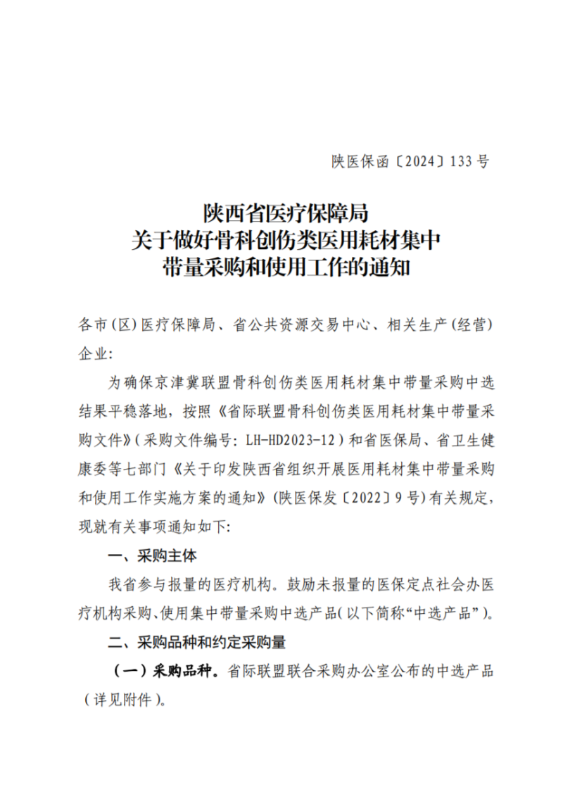 陕西省医疗保障局发布通知,要求做好骨科创伤类医用耗材集中带量采购和使用工作,对相关工作进行安排部署。