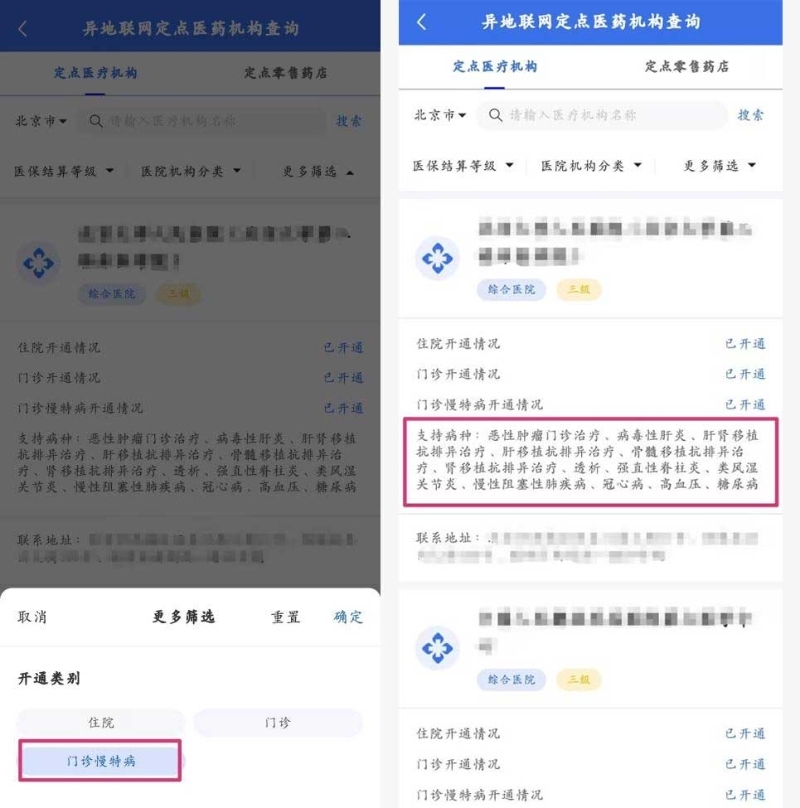 您可登录国家医保服务平台APP,在“异地备案”服务专区,点击查询服务下的“异地联网定点医药机构查询”,选择就医地,输入定点医疗机构名称,查询定点医疗机构门诊慢特病结算开通情况及支持病种;也可以点击“更多筛选”,在“开通类别”中选择门诊慢特病,查询就医地开通的所有门诊慢特病费用跨省联网定点医药机构。