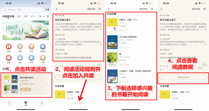 进入书城首页,找到共读活动专区,点击“加入共读”后阅读指定书籍即可。