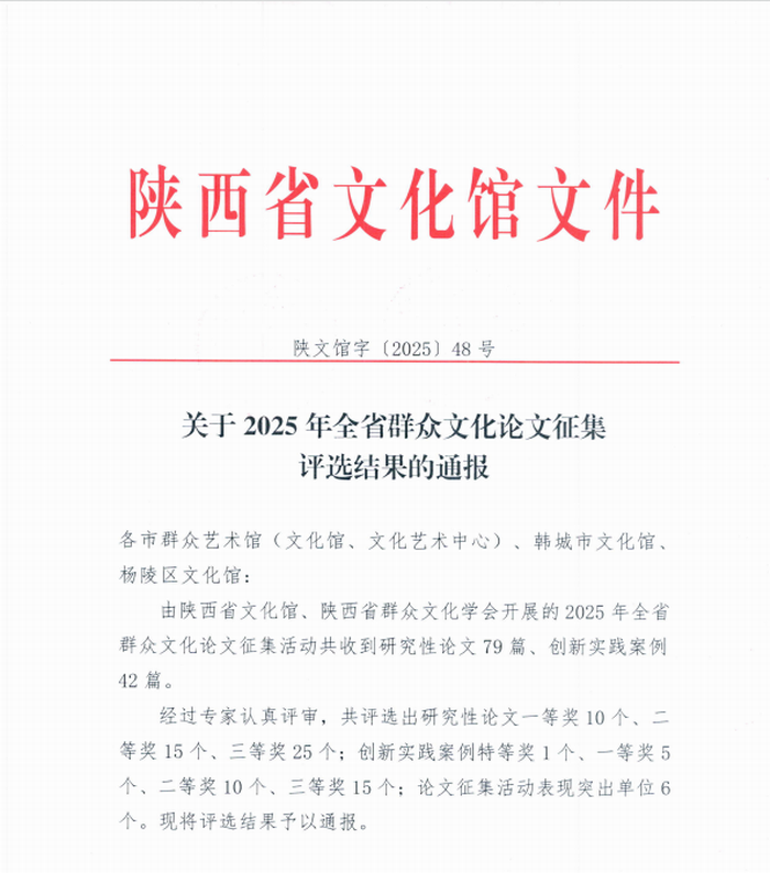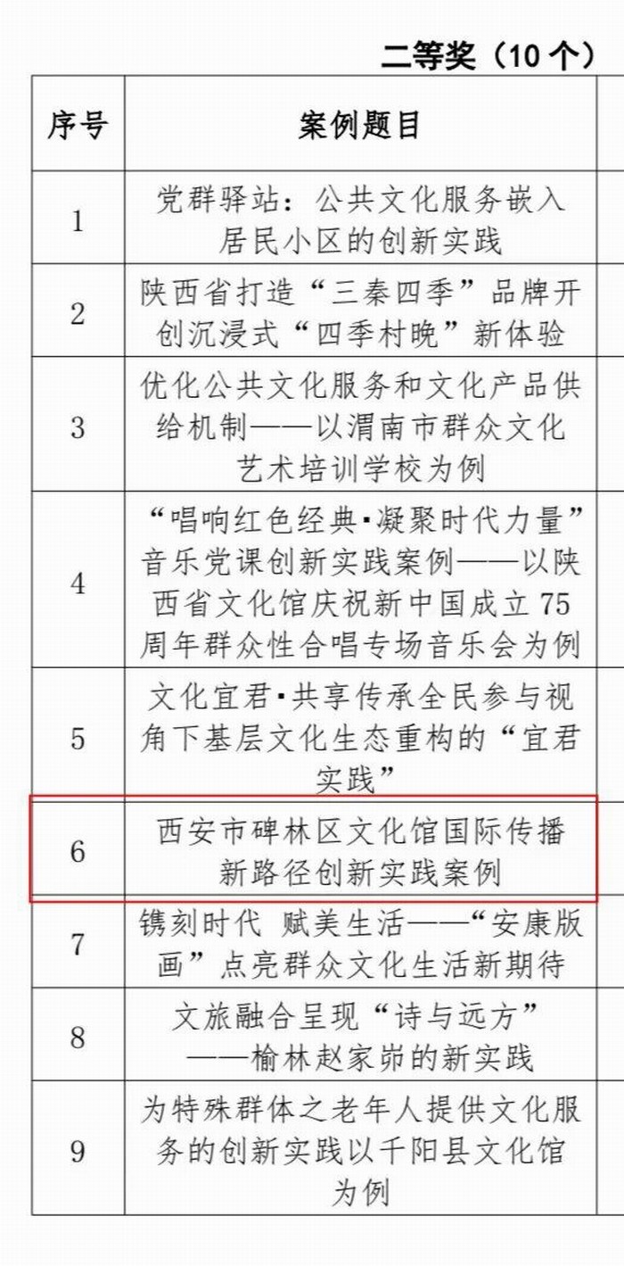 近日,2025年全省群众文化征文活动评选结果正式揭晓。碑林区文化馆报送的《西安市碑林区文化馆国际传播新路径创新实践案例》,凭借扎实的内容、鲜明的主题及对群众文化建设的深刻洞察,经专家评审委员会严格评审,荣获本次征文二等案例。