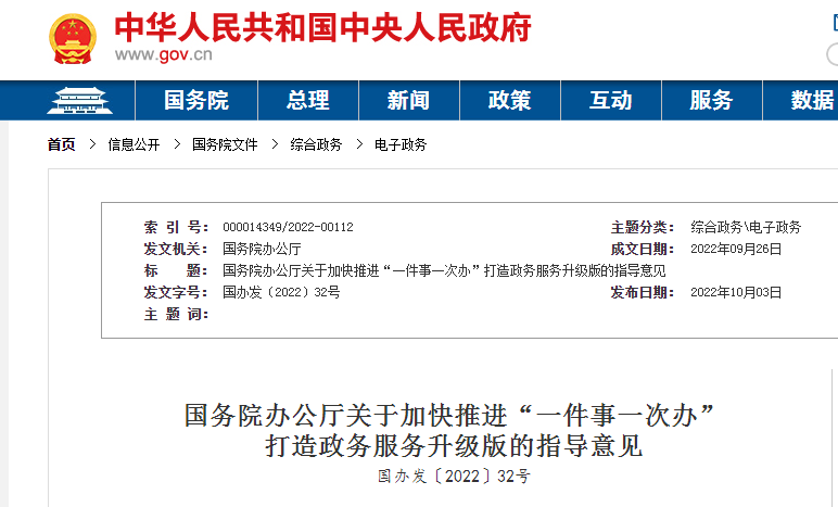 优化政务服务是加快转变政府职能、深化“放管服”改革、持续优化营商环境的重要内容,是加快构建新发展格局、建设人民满意的服务型政府的重要支撑。近年来,在深入推进政务服务“一网、一门、一次”改革、“互联网+政务服务”的基础上,一些地区进一步加大改革创新力度,将多个部门相关联的“单项事”整合为企业和群众视角的“一件事”,推行集成化办理,实现“一件事一次办”,大幅减少办事环节、申请材料、办理时间和跑动次数,得到企业和群众的普遍认可。同时,各地区在实施过程中还存在系统对接深度不够,数据共享难,不同地区集成化办理服务的名称、标准、规则不一致等问题,制约了“一件事一次办”推广。为加快推进“一件事一次办”,打造政务服务升级版,提升政务服务标准化、规范化、便利化水平,更好满足企业和群众办事需求,经国务院同意,现提出以下意见。