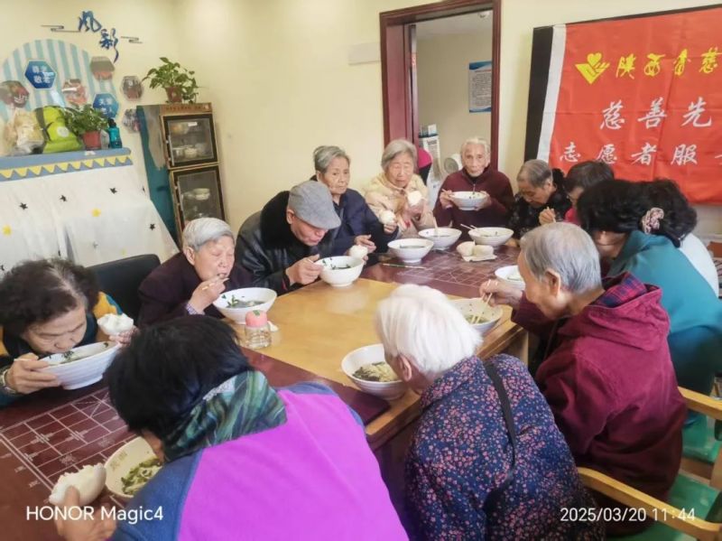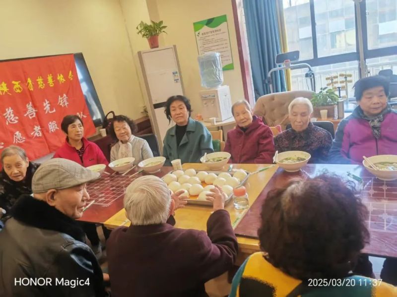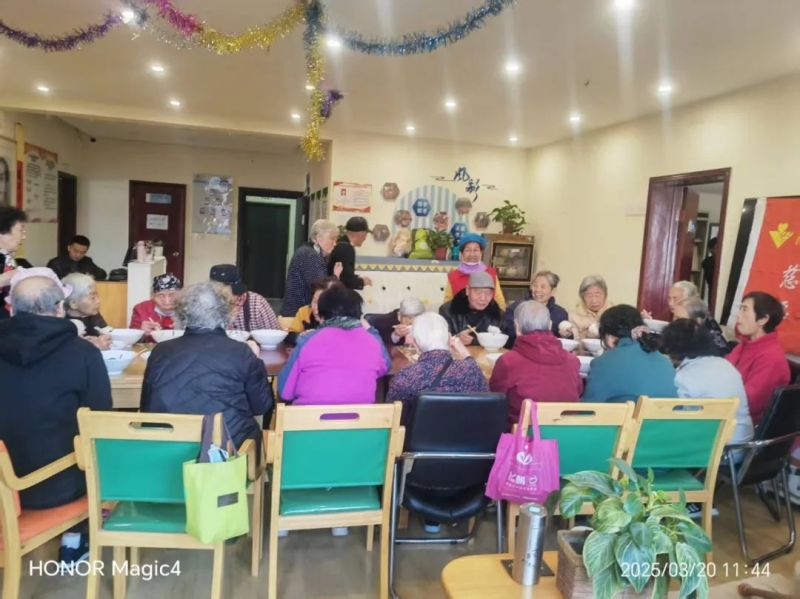 李阿姨小心翼翼地端起碗,轻轻吹了吹,舀起一个馄饨放入口中,脸上立刻露出满足的神情,嘴里念叨着:“这馄饨薄皮大馅,味道好极了,好久没吃过这么合口味的馄饨啦。” 93岁张叔叔吃得畅快,一边大口吃,一边竖起大拇指对旁边的志愿者说:“你们太贴心啦,这馄饨香,心里更是暖乎乎的。”还有几位老人边吃边唠家常,分享着生活里的趣事,欢声笑语回荡在整个大厅。大家的筷子在碗中不停翻动,热气腾腾的馄饨,不仅驱散了身体的寒意,更温暖了彼此的心。