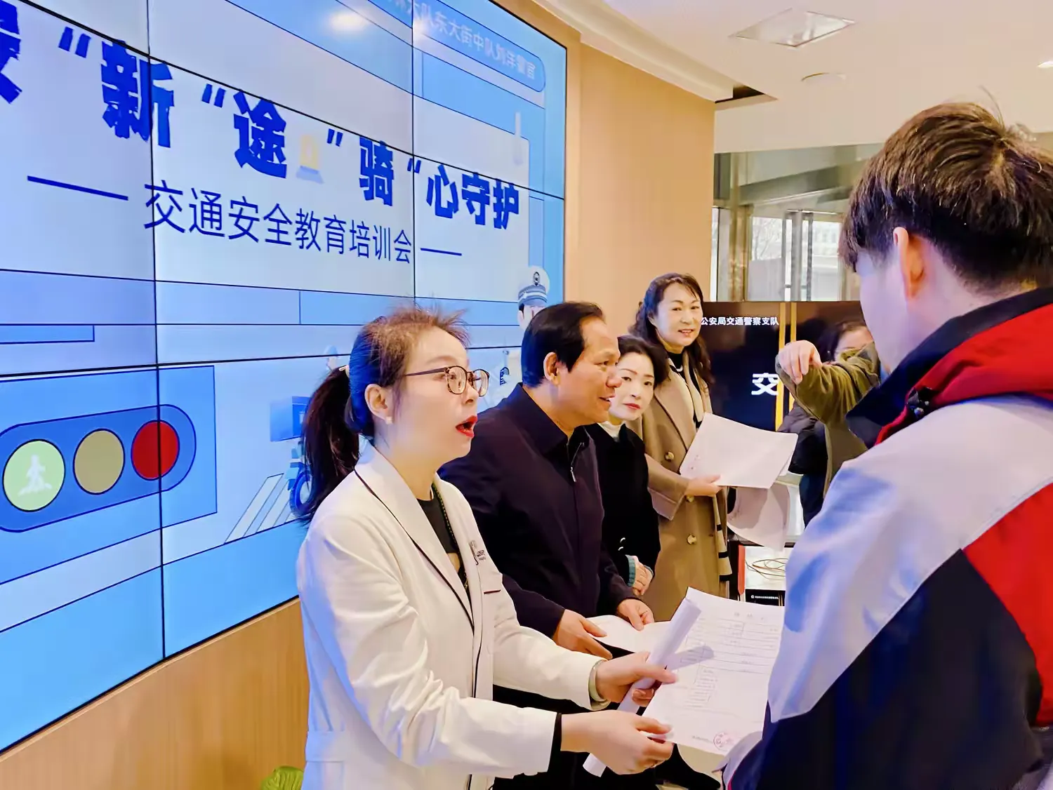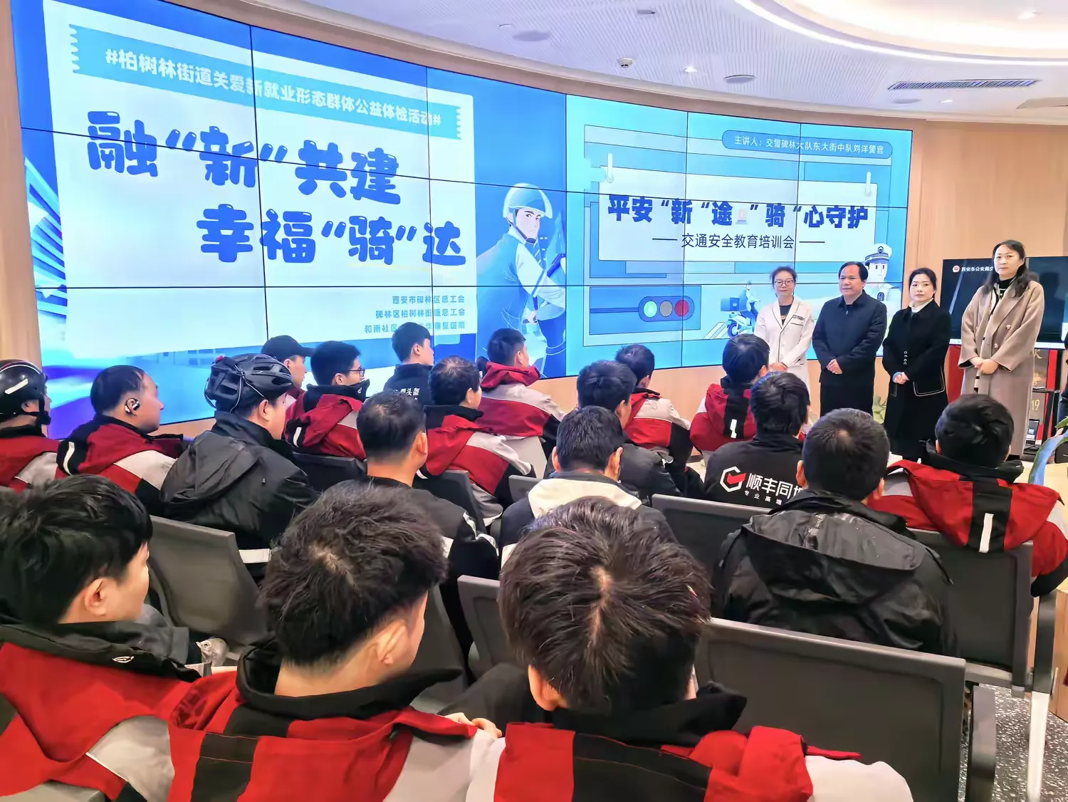 随后,为进一步提升快递员的交通安全意识,来自交警碑林大队东大街中队的刘洋警官为小哥们进行了交通法规宣传培训。根据日常发生的交通事故率,刘警官通过讲解《西安市非机动车安全管理条例》,正确佩戴头盔的方法,播放警示教育片等,引导大家争做文明出行的示范员。