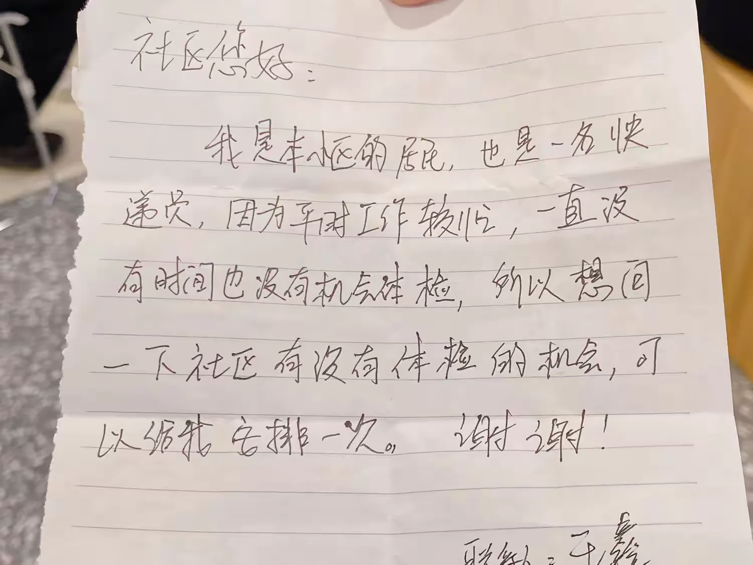 活动背后还有一个故事,居住在东十道巷39号院的快递员小哥先前就注意到社区在院门口安装了“和·声”信箱,还碰见过好几次社区工作人员来取信,因此前不久抱着试一试的心态也写了信,表达了自己每天忙于送件养家,根本没时间,也舍不得花钱体检的苦恼。没想到前一天刚投递信,第二天就有社区工作人员联系他,表示会找合适的时机为他安排免费体检。随后和南社区党委联系“和·声”服务联盟志愿单位西安先华康复医院,说起了公益体检活动的构思,大家一拍即合,于是促成本次活动的成功举办。